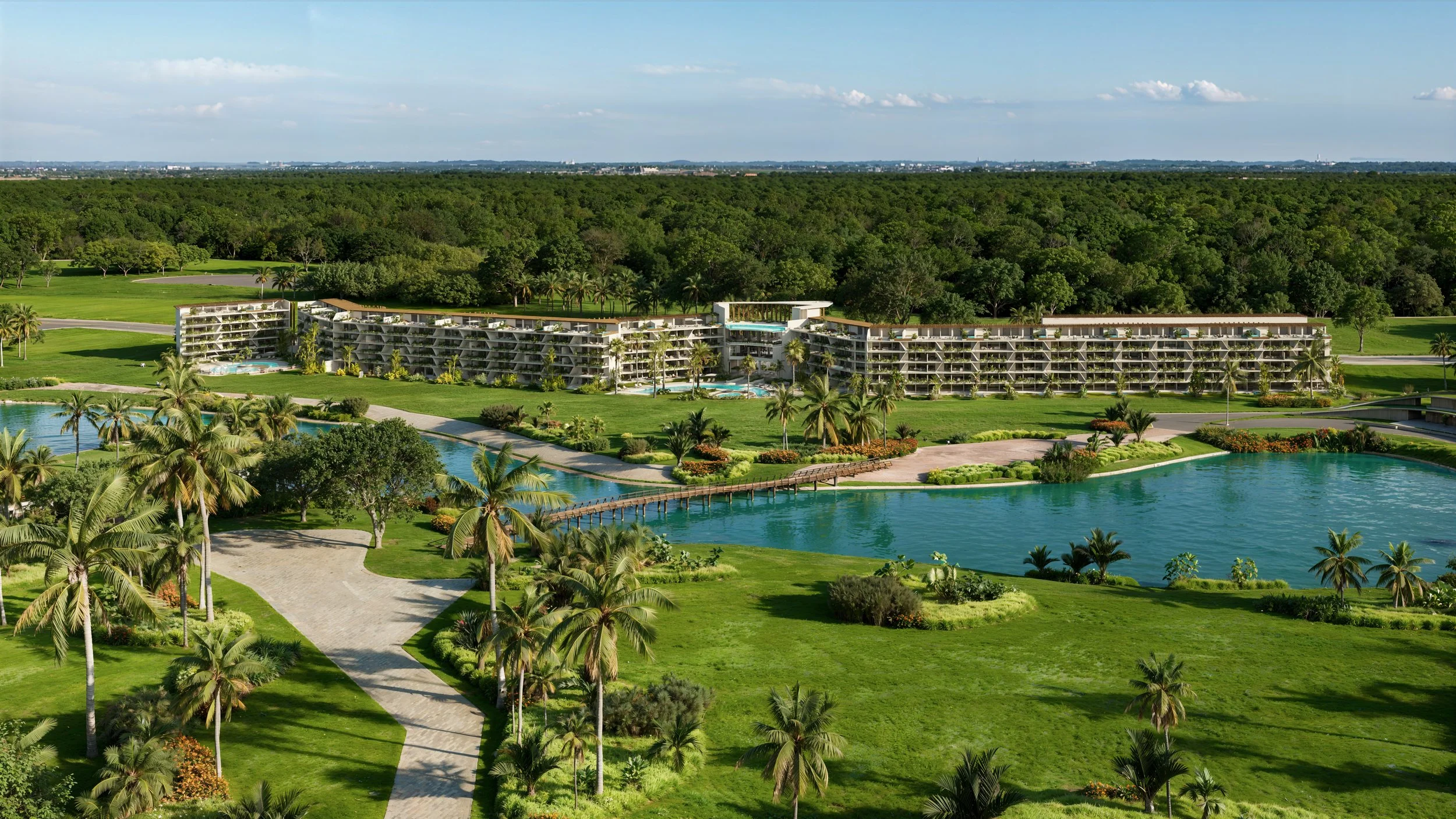 Coral Lake is an exclusive residential project offering 330 strategically located apartments facing the lake, with privi-leged views of the golf course. Each of our units is fully furnished, providing a sophisticated and hassle-free lifestyle from day one. The project consists of 5 levels plus the rooftop, with exclusive amenities including 4 pools, a sky bar, gym, coworking space, and restaurant.